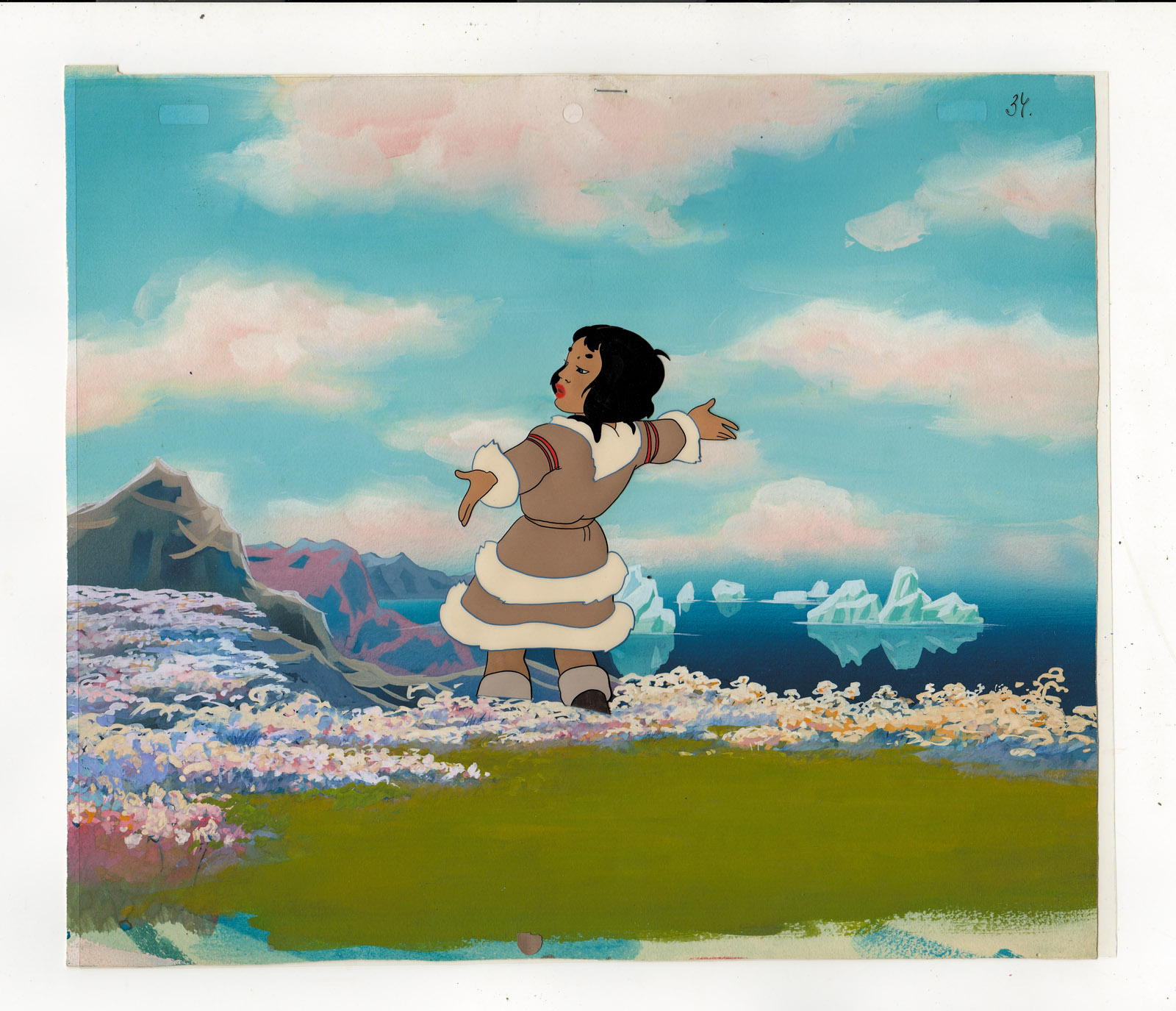 На илл.: Мультфильм «В яранге горит огонь». 1956. Сцена. Целлулоид, бумага, краска заливочная, гуашь.