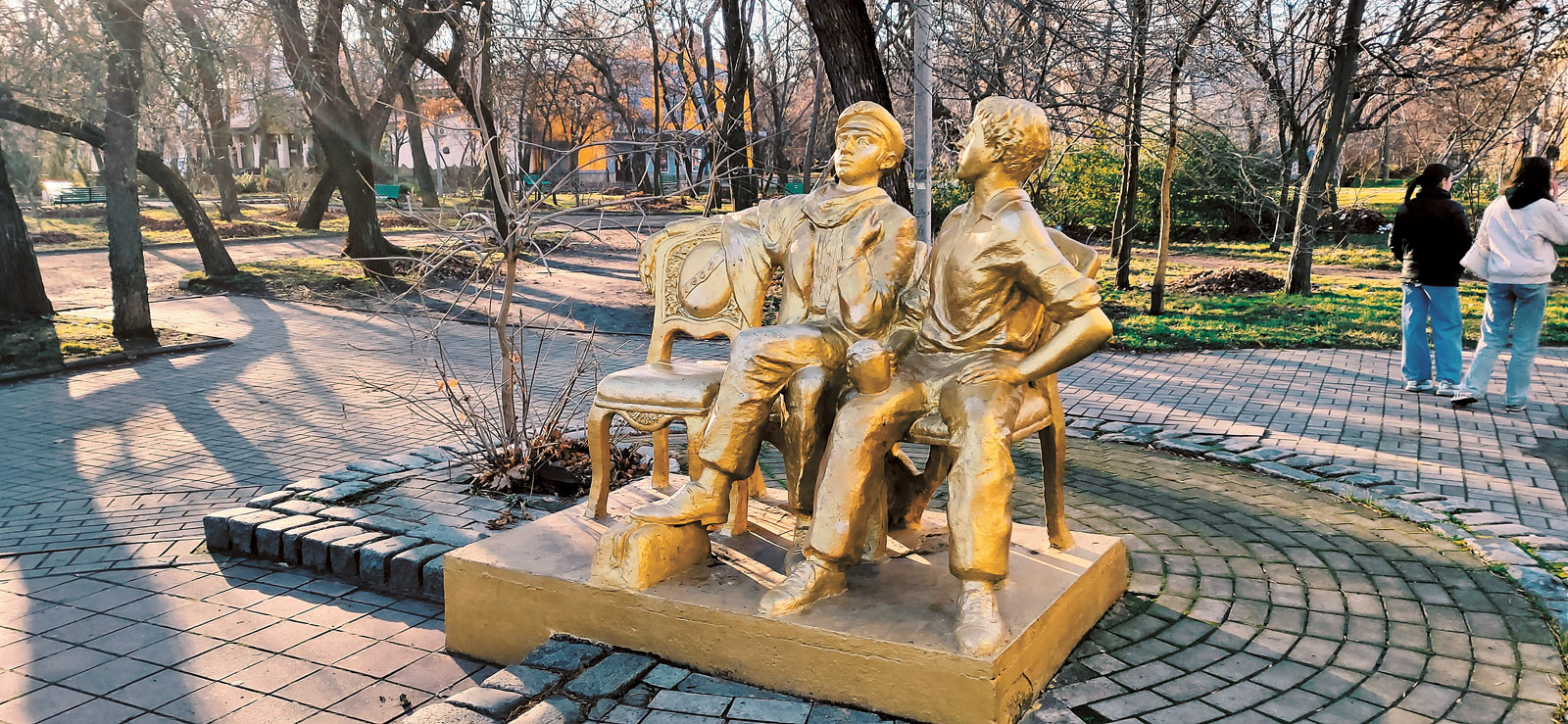 «Остап Бендер и Шура Балаганов». Герои «Золотого телёнка» Ильфа и Петрова, «дети лейтенанта Шмидта» обосновались поблизости от парка, который носит имя Петра Шмидта. Но не командира революционного крейсера «Очаков», а его отца, служившего начальником города и порта Бердянск в 1890‑е годы.