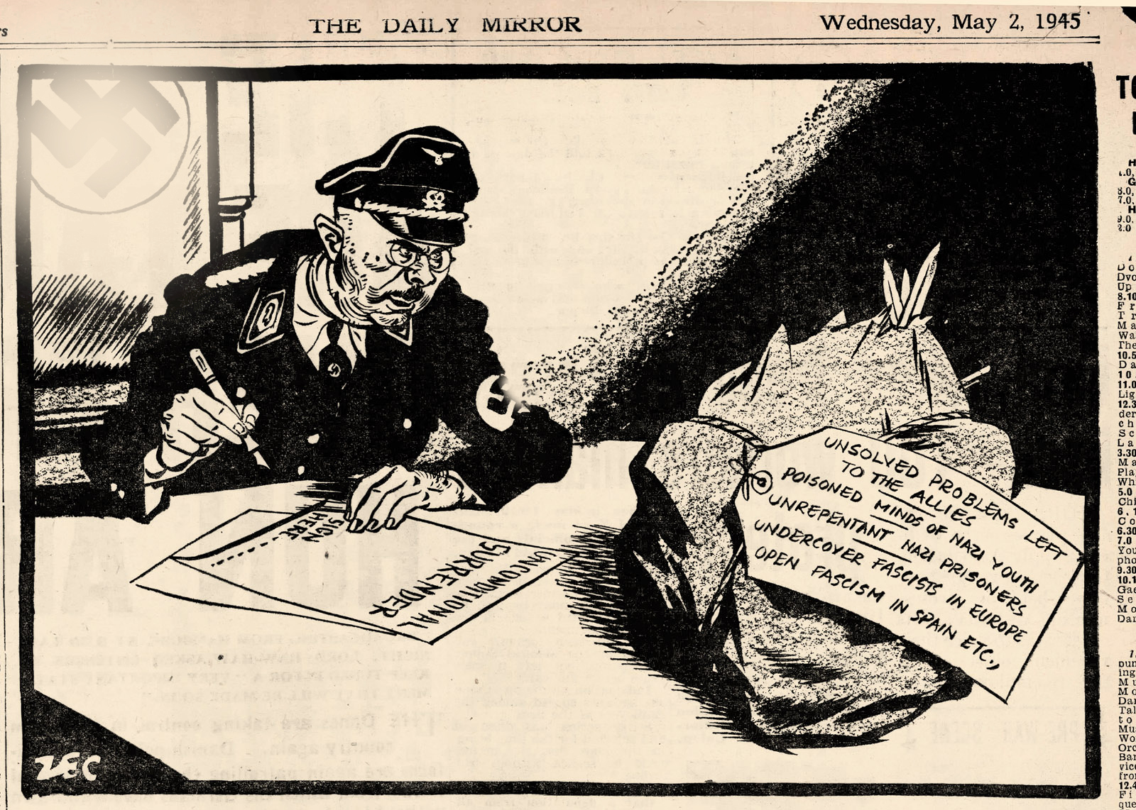 На илл.: The Daily Mirror. 1945. 2 мая. На акте, лежащем на столе: «Безоговорочная капитуляция», «Место подписи». На свёртке: «Нерешённые проблемы, оставленные союзникам: отравленные умы нацистской молодёжи, нераскаявшиеся пленные нацисты, фашисты под прикрытием в Европе, открытый фашизм в Испании и т.д.». Карикатура опубликована с целью сформировать негативное отношение к идеологии нацизма.