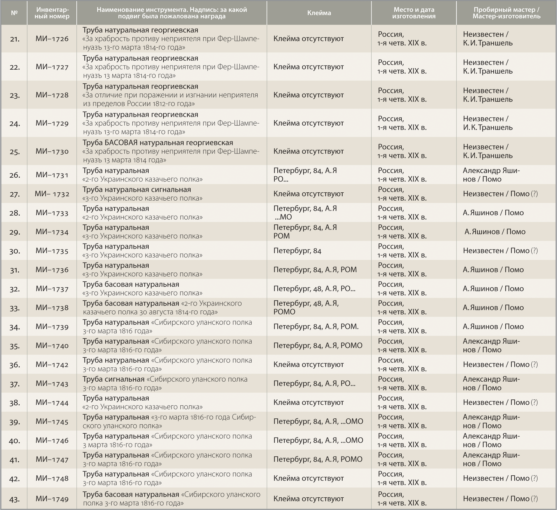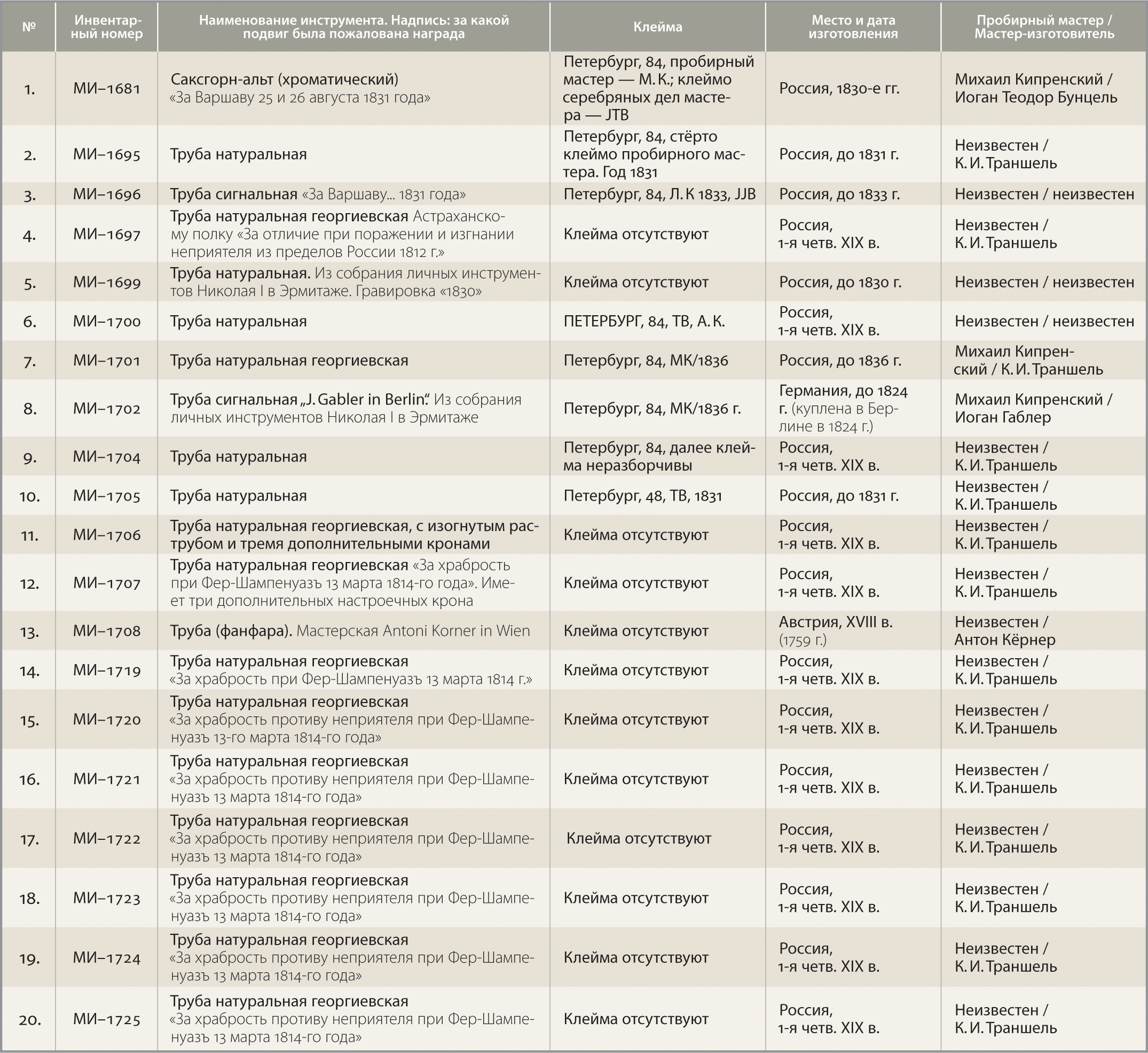 До настоящего времени специалистам не удавалось установить происхождение и имена мастеров‑изготовителей российских наградных военных серебряных сигнальных труб [2]. Дело в том, что на духовых инструментах, которые российские императоры приобретали для нужд армии или в личное пользование, как правило, имеются гравированные авторские подписи российских или европейских мастеров. В фондах Российского государственного военно‑исторического архива хранится документ, свидетельствующий о закупке императрицей Елизаветой Петровной в Вене у мастера Антона Кёрнера духовых инструментов для шляхетного кадетского корпуса [3]. Повествуя о повседневной жизни российского императорского двора ХIХ–ХХ веков, И.В. Зимин приводит свидетельства о затратах Николая I на покупку в личное пользование музыкальных духовых инструментов в Германии у таких мастеров, как Габлер, Грислинг & Шлотт, а также у петербургских инструментальных мастеров И. Эшенбаха и А. Гине [4], тогда как на наградных военных серебряных сигнальных трубах авторские подписи мастеров отсутствуют.