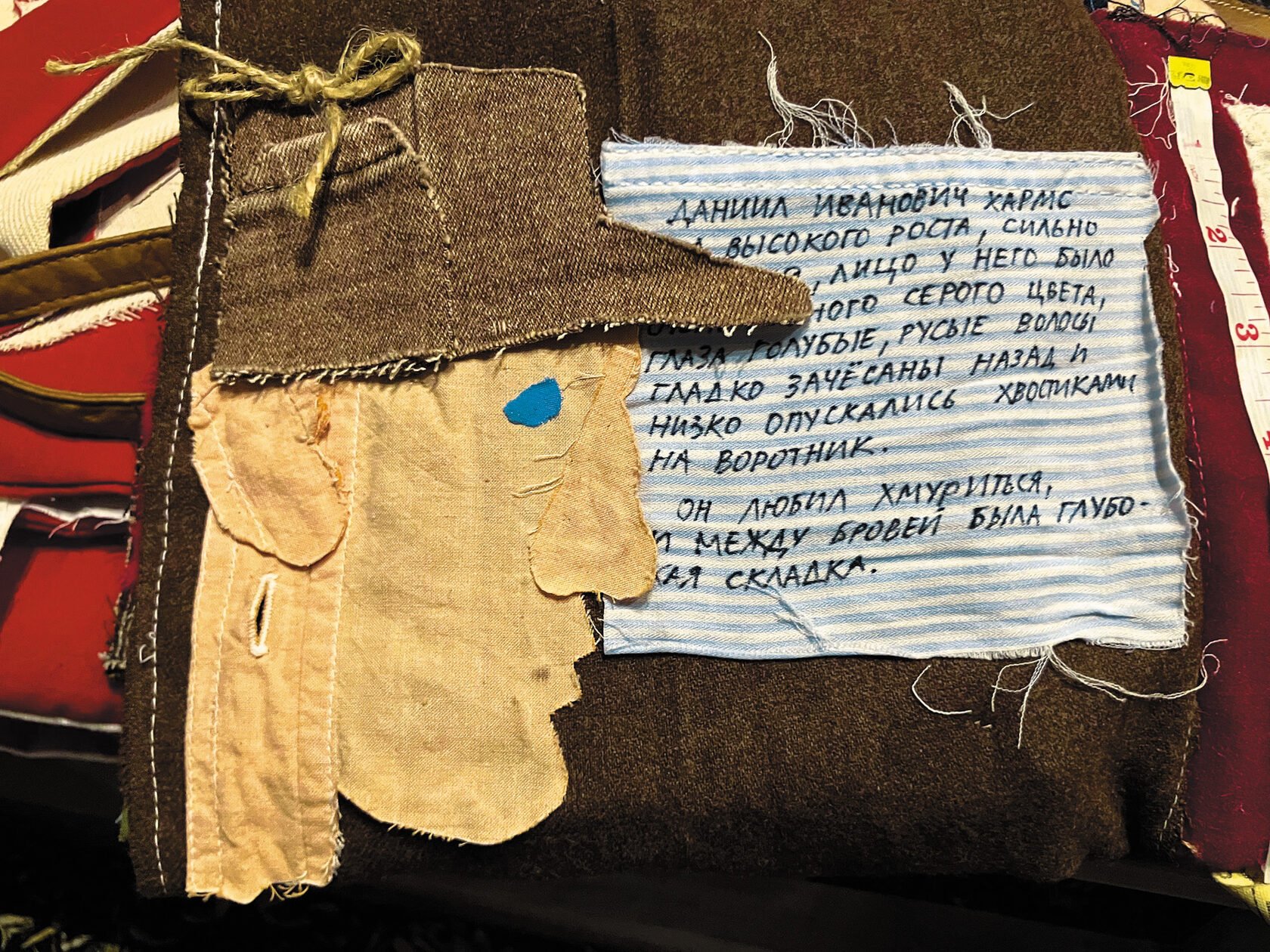 А за столом — творческая лаборатория, поучаствовать в которой предлагается каждому посетителю: можно взять со стола хлопчатобумажный белый «лист» и написать на нём несмываемым маркером несколько строк Хармса или Введенского, с помощью азбуки‑печати поставить инициалы автора, добавить для атмосферности обрывков нот, старых фотографий (все они тут, на столе, чёрно‑белые, заранее заготовленные) — и закрепить готовое произведение на стене, превратив тем самым статичную выставку в иммерсивную.