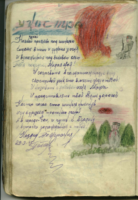 В экспозиции представлены и рукописные песенники, создававшиеся бойцами, и современные звуковые реконструкции этих фронтовых фольклорных песен, а также некоторые другие экспонаты из коллекции фольклора Великой Отечественной войны — песни, частушки, самодеятельные солдатские стихотворения, дневники, собранные сотрудниками ГМЛ во время войны.