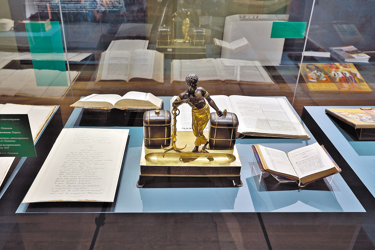 На фото: А.С. Пушкин. Лист рукописи стихотворения «Моя родословная». Воспроизведение. Чернильный прибор с арапчонком. 1‑я четв. XIX в. Бронза, литьё, чеканка, золочение, патинирование. А.С. Пушкин. IV глава из исторического романа (Северные цветы. 1828).