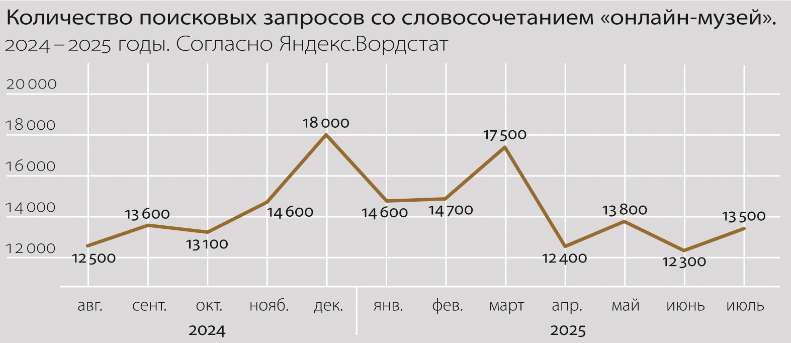 Согласно данным Яндекс.Вордстат за 2023–2025 годы, каждый месяц пользователи ищут онлайн‑музеи от 20 до 50 тысяч раз, или от 500 до 2500 раз в сутки.