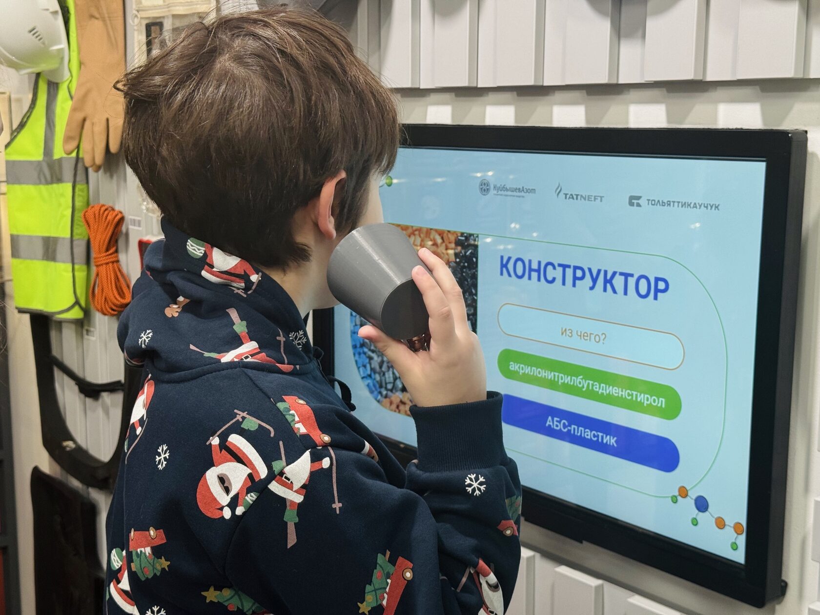 Для нас было важно решить задачи, направленные на всестороннее восприятие и живое участие детей двух разных возрастных групп: 3–6 лет и 7–12 лет. Первый приём — воздействие на все органы чувств. Дети, не умеющие или не желающие читать, могут послушать информацию, приложив к уху монофон. Популярны и звуковые модули «Звуки леса» и «Звуки завода», рассчитанные на детей 3–6 лет. На интерактивных экранах разных разделов представлен познавательный контент: можно бурить, а можно играть в игры. Например, в разделе «Таблица Менделеева» ребята на экране собирают молекулы, узнают, какие химические элементы есть в еде, а играя в «Химмемо», знакомятся с составом веществ. Запах тоже можно ощутить: в специальных баночках лежат образцы нефти, синтетического и натурального каучуков. Потребность в тактильном восприятии закрывают практически все интерактивные, мобильные модули и экспонаты. Но как же ощутить вкус? Всё просто: надо пожевать жевательную резинку, которая, как и шины автомобиля, сделана из синтетического каучука.