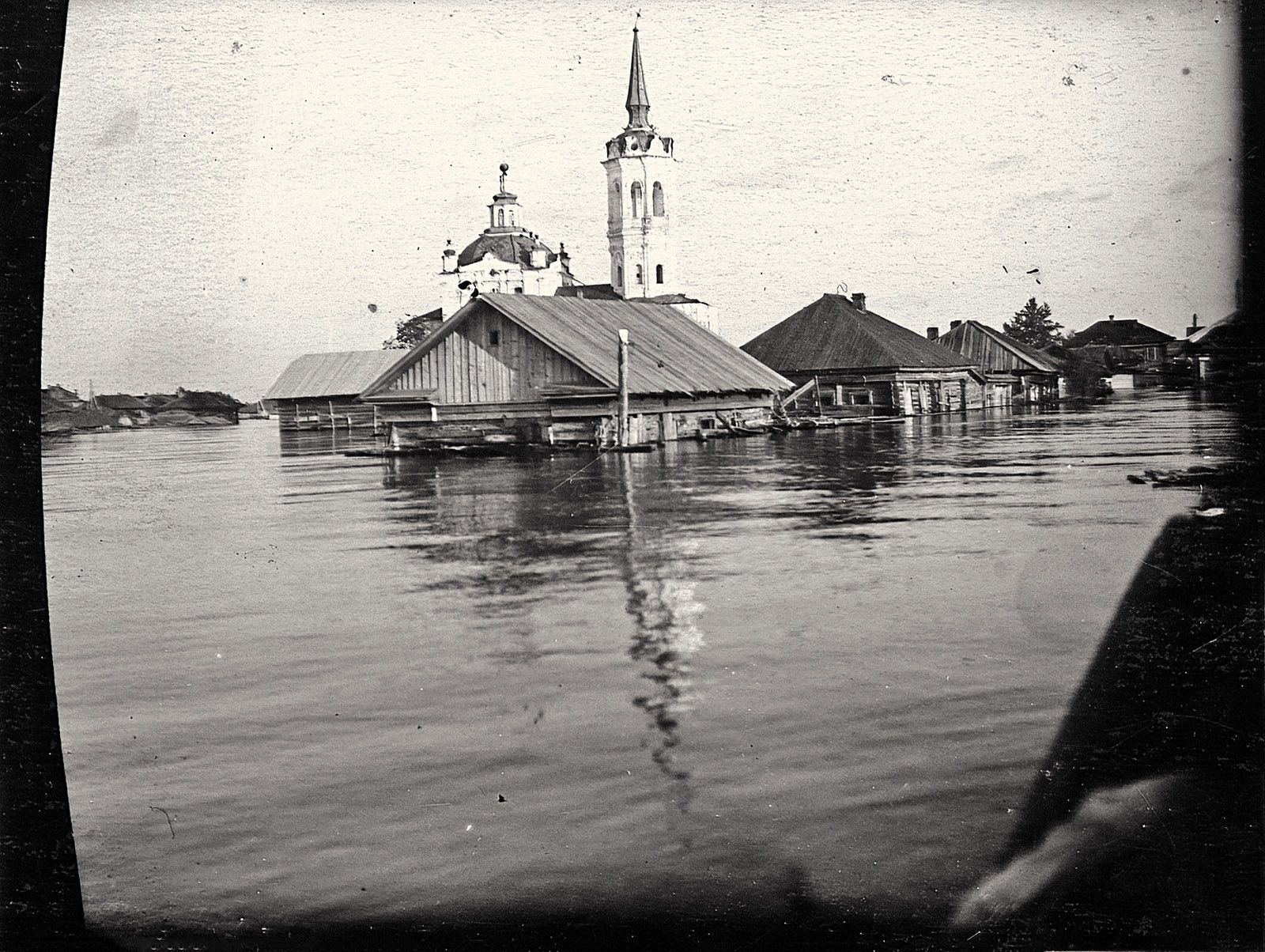 На фото: Наводнение в Тобольске. 1941 г. Вид с улицы Семакова на затопленные дома у Покровской (Крестовоздвиженской) церкви (справа). Фото М.П. Тарунина.