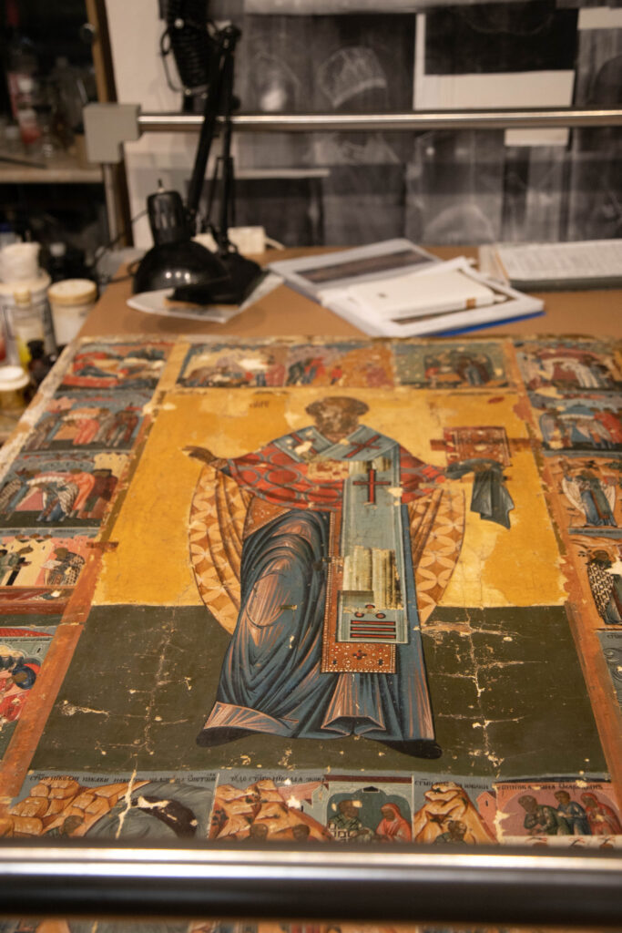 Под руководством художника-реставратора Лилии Васильевой и хранителя фонда древнерусской живописи Юлии Комаровой икона прошла полный цикл исследований и реставрационных работ. Под слоями поздней живописи и потемневшего лака специалисты обнаружили фрагменты авторского письма XVI века. Икона написана на трёх досках северной сосны, что подтверждает её происхождение с Русского Севера.